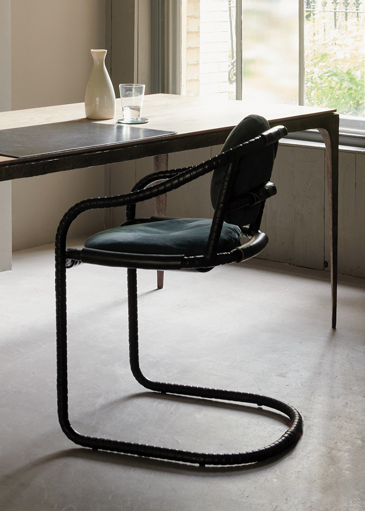 frame wrapped in saddle leather with slung seat and detachable nubuck back and seat cushions
