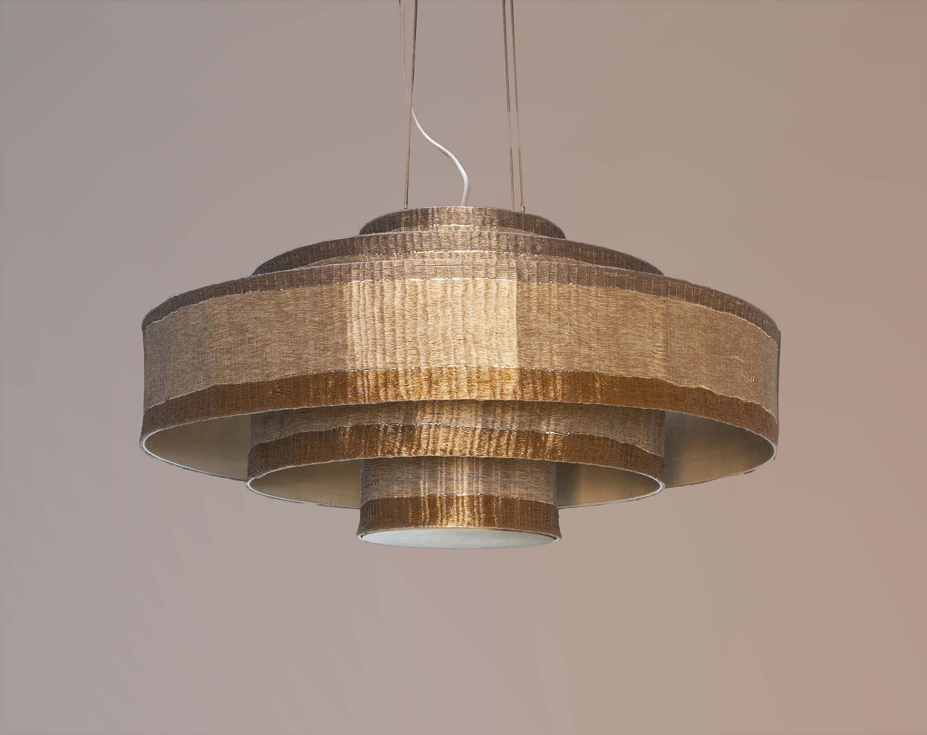 three concentric tiers of woven metallic fabric over stretched silk, with base diffuser