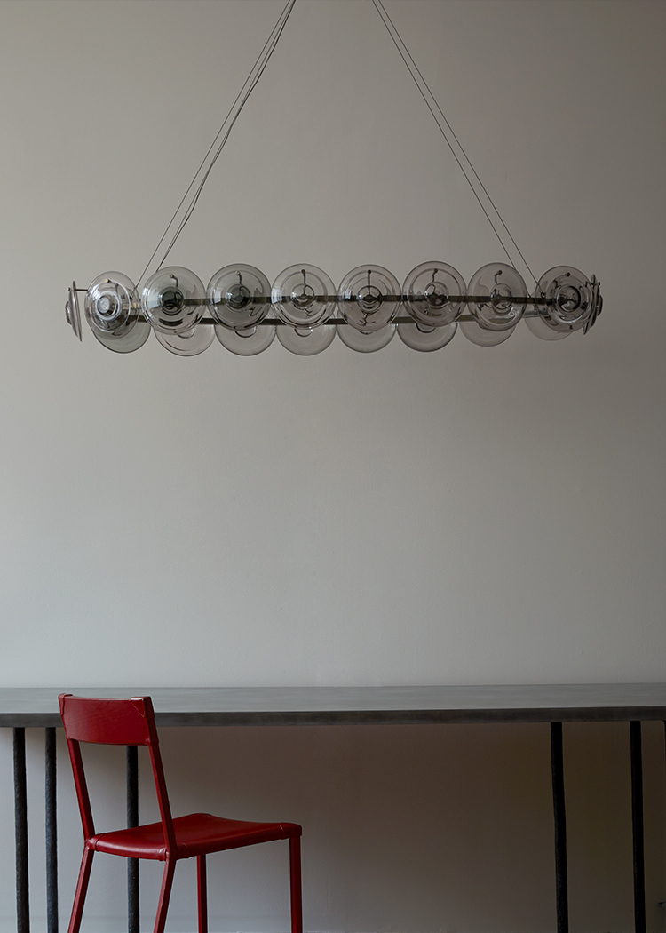 solid coloured hand blown glass discs in ash or coral, illuminated by LED with blackened nickel frame