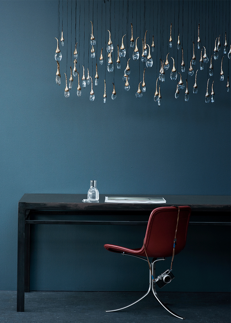 installation with solid cast bronze buds in polished bronze or satin nickel finish, each housing a glass drop illuminated by LED